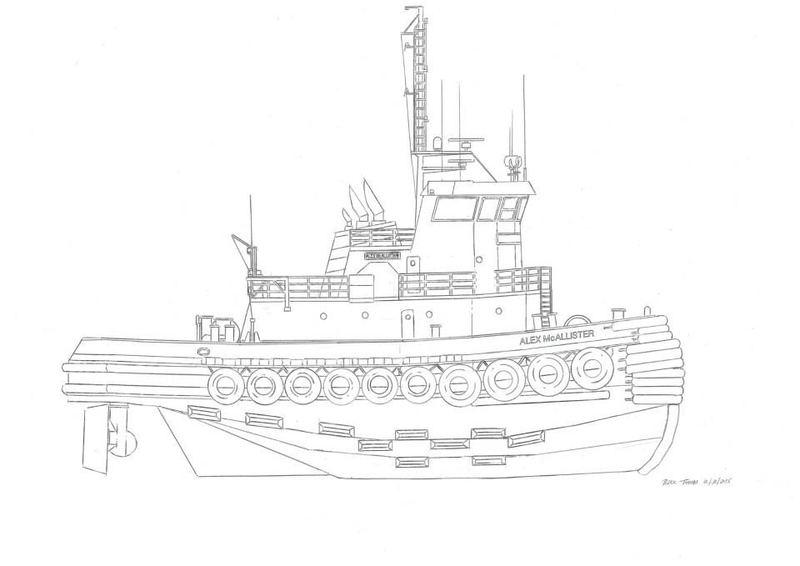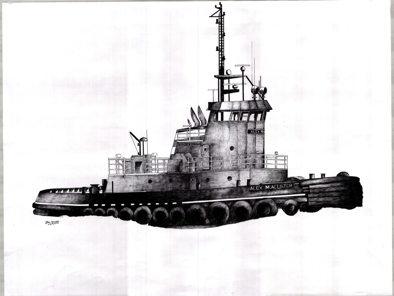 RENDERED, BLACK, AND WHITE ART FOR THE TUG ALEX McALLISTER