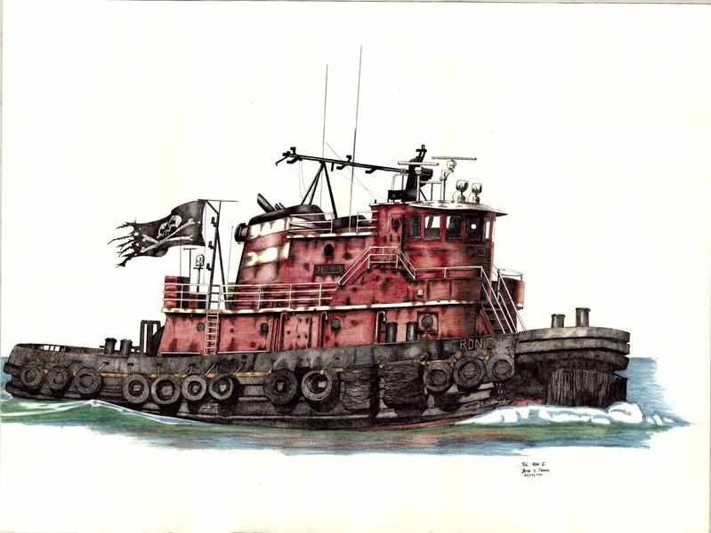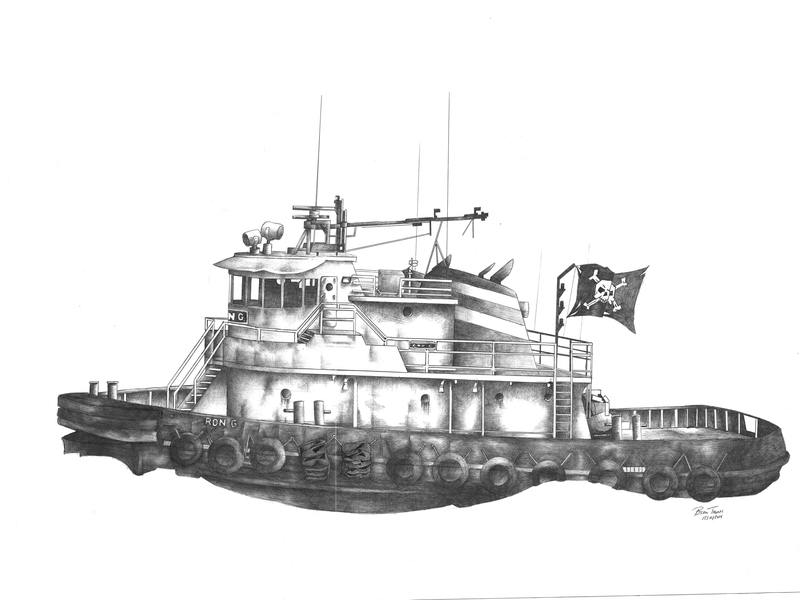 RENDERED, BLACK, AND WHITE ARTWORK OF THE TUG RON G.