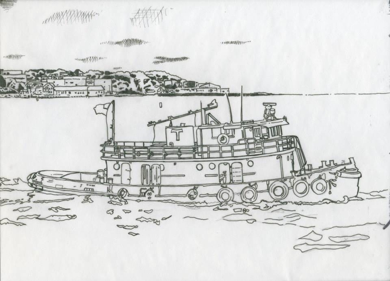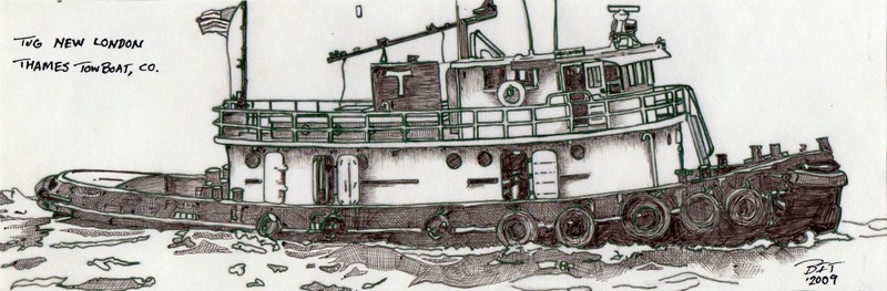 formerly owned by the Thames Towboat Company of New London, Connecticut. Rendered here in line, black and white, done with a bic pen.